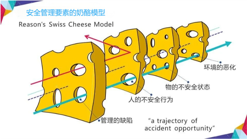 英国心理学家James Reason提出,事故的发生是因为多层防御体系(奶酪片)上的漏洞(孔洞)在特定时刻连成了一条线。