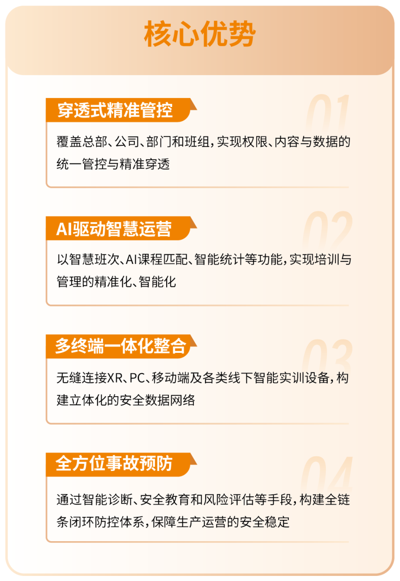 公司依托创新技术,助力企业在标准数智安全培训工具、一站式数智安全基地、智慧安全运营与管理、实战化AI数字应急演练、全方位事故预防服务、专业岗位技能培训等领域实现模式突破。