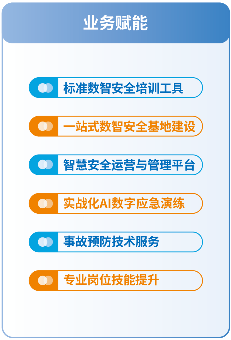 构建“1+6”核心业务体系,以幻威数智安全操作系统(HuanOST)为核心支撑,为企业提供标准化安全培训产品、一站式安全实训基地建设、智慧运营管理平台构建、实战化AI数字应急演练、全方位事故预防、专业岗位技能水平提升六大服务,实现安全培训、应急处置、安全管控的全面智能化升级。